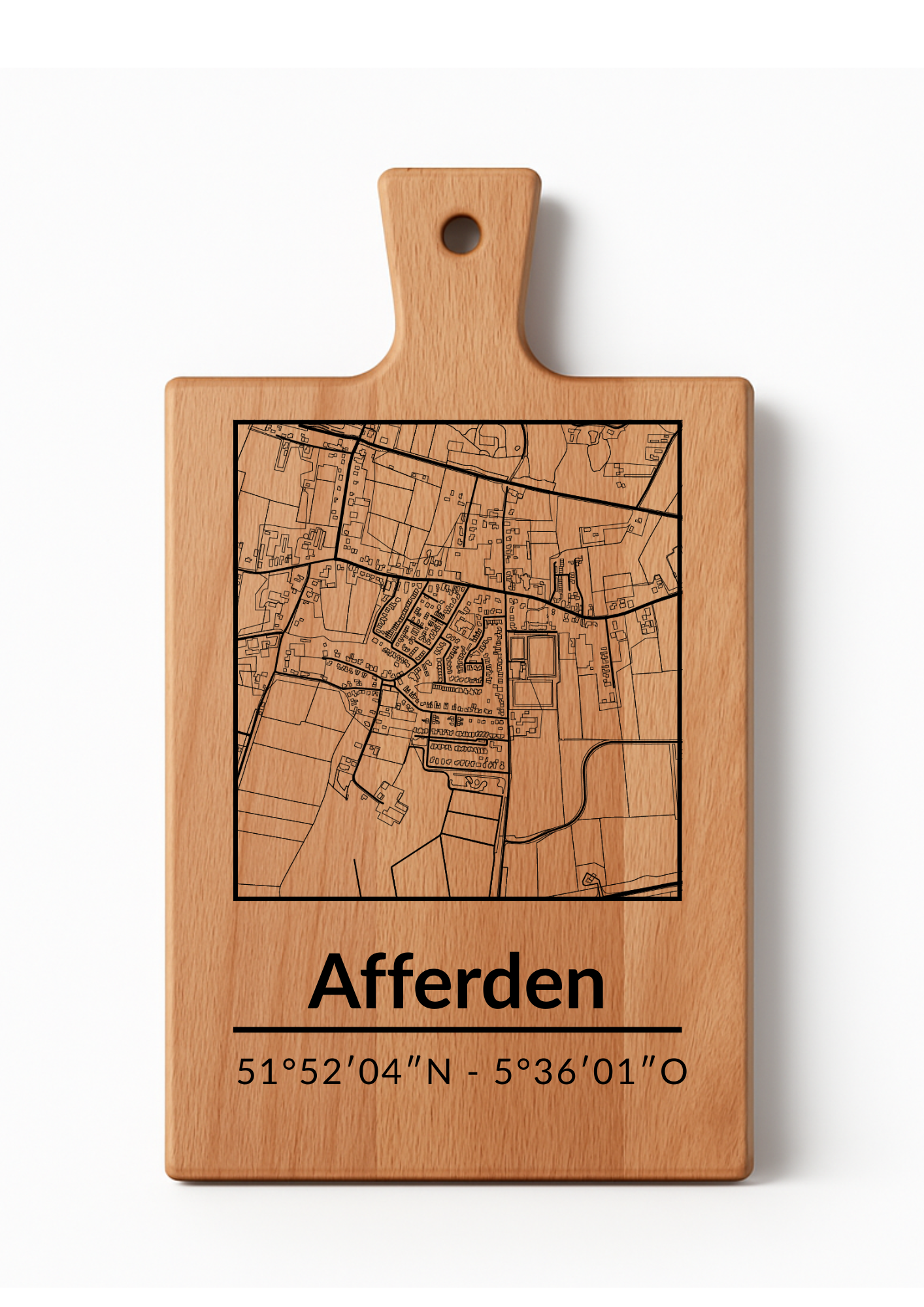 Borrelplank Afferden - Serveerplank van Beukenhout met Gravure Dorpsplattegrond - Oakman Objects